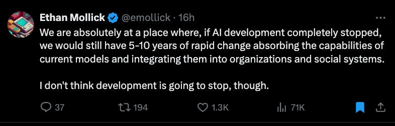 Ethan Mollick (@emollick) shares a thought-provoking perspective on AI's ongoing impact. Explore this tweet.