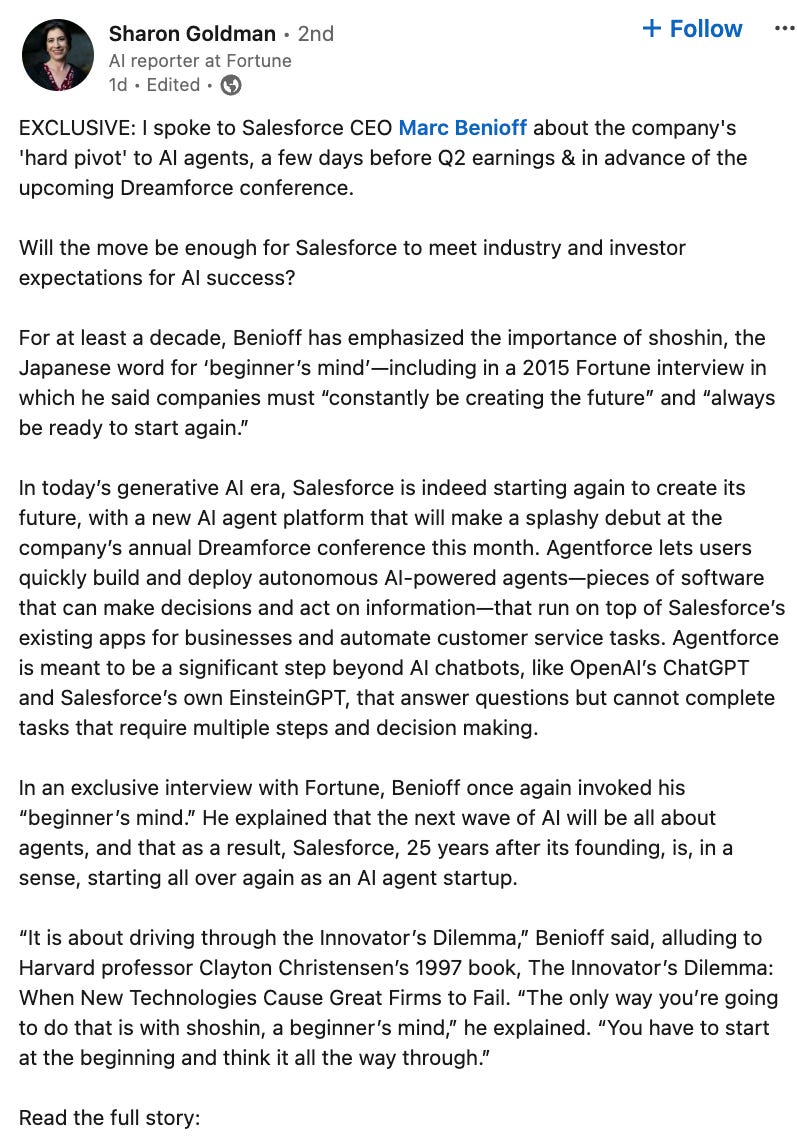 Sharon Goldman reports on Salesforce CEO Marc Benioff's 'hard pivot' to AI agents. Benioff invokes the concept of 'shoshin' (beginner's mind) as Salesforce introduces Agentforce, an AI agent platform set to debut at Dreamforce. Read the post.