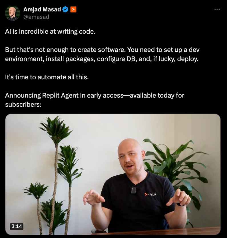 Amjad Masad (@amasad) announces Replit Agent, emphasizing that while AI excels at writing code, creating software involves much more. Replit Agent aims to automate the entire process - from setting up dev environments to deploying applications.